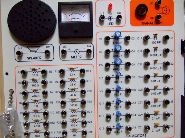 MY KIT 150是用以彈簧式接頭再用配線將電阻電容等等的零件配接起來,能自由的配線形成電路