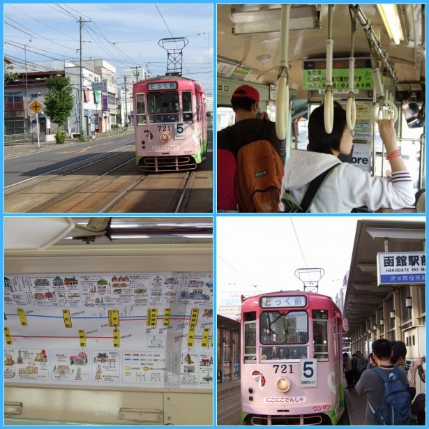 離開五陵廓接著要來去體驗台灣所沒有的路面電車了,目前日本也僅有幾處還保留著,其中北海道的函館及札幌都還看的到,我們要搭的路線車輛過來了,粉紅色塗裝,幾乎每輛車顏色都不同~還有黃色綠色白色藍色....數不清了