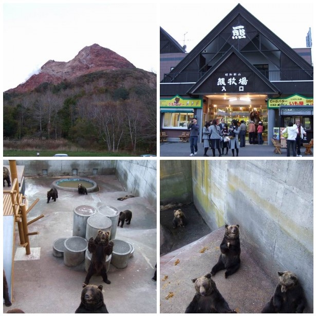 拉車拉2個多小時終於抵達火山爆發所隆起的山嶺-昭和新山,旁邊的熊牧場,可以買餅乾跟蘋果餵熊喔,還會雙掌合十向你乞食..超可愛..蘋果丟下去直接張口接住,整天被遊客餵都餵飽了