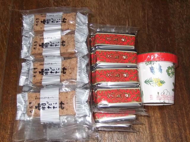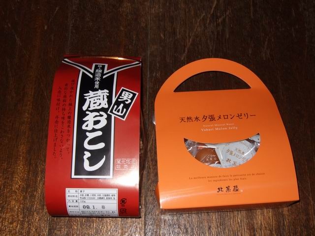 男山酒造的米果及北菓樓的哈密瓜果凍,其實很想要買男山酒造的酒貽,可是需要冷藏只能馬上祭五臟廟,酒也很好喝,可是我懶得提。北菓樓的泡芙導遊買給我們吃了,真的好吃,可是後來進去才3點多而已,整家店的東西都像被狂風掃過一樣賣的差不多了,只好就買個哈密瓜果凍。