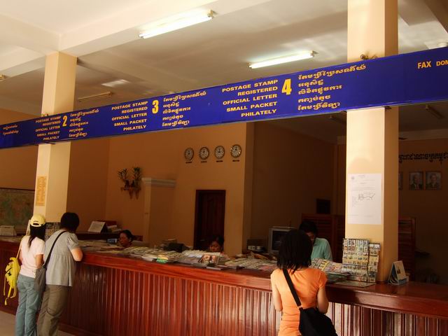 接著郵局就在旁邊而已,嘟嘟車在一旁等著,我們步行走過去一下就到了,看起來應該是法國殖民時期的建築,一進去櫃臺上擺滿了販售的郵票及明信片,想必都是要賣給觀光客的,隨行的人買了一張明信片,沒有買郵票請服務人員直接蓋上郵戳。