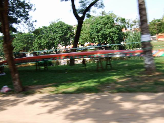 結束之後要趕回飯店去整理行李拿出房間了,途中嘟嘟車司機希望能帶我們順道去其他商家晃一下,不買東西也沒關係,看了一下時間還允許就也進去看了個5分鐘,沿路還可以看到擺著龍舟。回到飯店整理玩後11點隨即準備收拾離開美麗殿酒店去餐廳吃午餐,在柬埔寨的最後一餐吃的是柬式風味餐,不過應該也是有改良過比較適合台灣人口味的吧,只是桌上的那瓶高棉補酒就沒人有興趣碰他了。