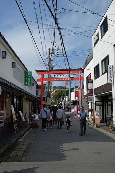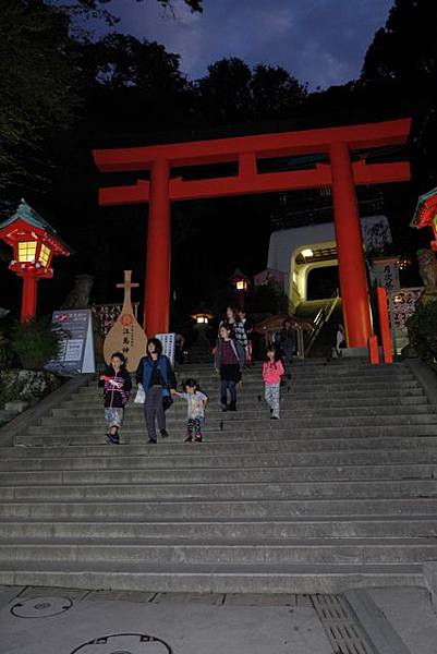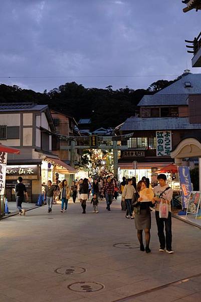 走到江之島後,江島神社前面商店街還是滿滿人潮購物跟品嚐美食,這時江島神社排隊參拜的人依舊不少,跟著參拜完之後往江之島展望燈塔走去,一路都是往上爬的路線,很奇妙的是居然有設置了電動手扶梯,不過需要付費才能搭乘,可是電梯只往上,要下來還是得慢慢走才行,因為本來就沒計畫要進去展望塔,所以就回來找個店家吃晚餐吧。
