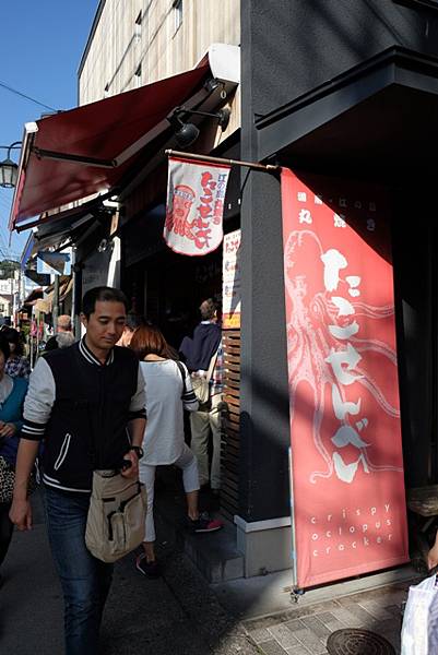 離開高德院前往長谷寺的路上,看到一旁店家很像在賣可麗餅的店家,停下來看一下居然是不一樣的章魚燒啊,將3隻章魚裹粉後放入鐵板後以高溫壓製而成章魚仙貝,買了一片來嚐嚐看,燒燙燙的口感酥脆真是讚,心想臺灣人怎麼還沒學回來開店啊。