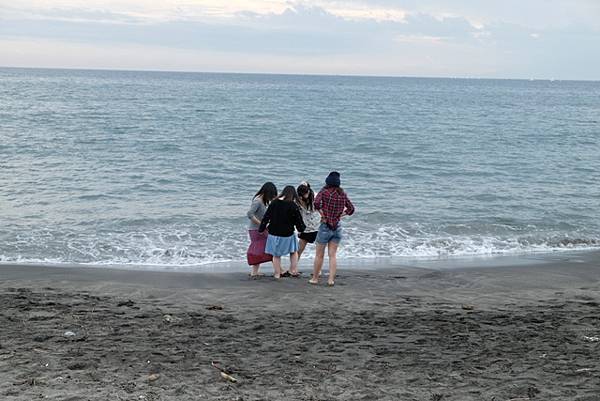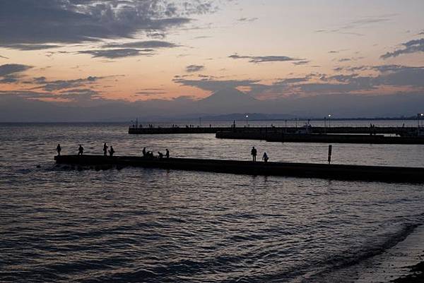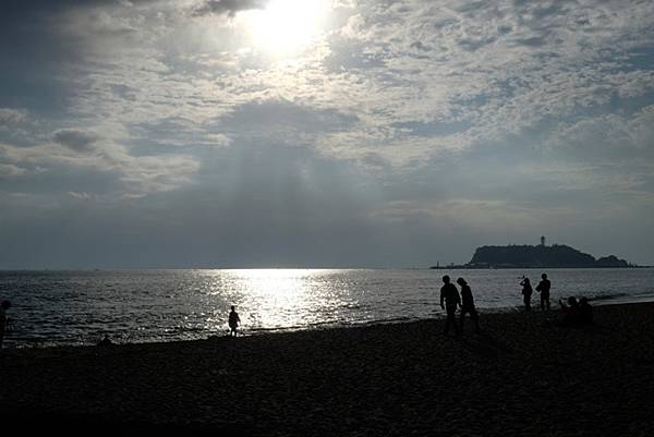 回到長谷站搭上江之電,在七里濱站下車沒多遠的地方就可以走到沙灘去了,雖然天空陰陰的還是有些人在海邊戲水,遠處還有在衝浪的人,江之島就在遠遠的彼端。