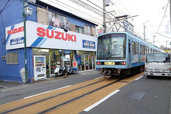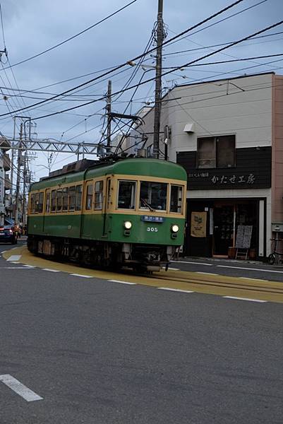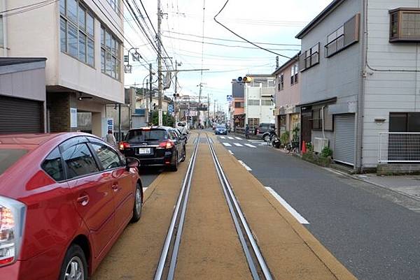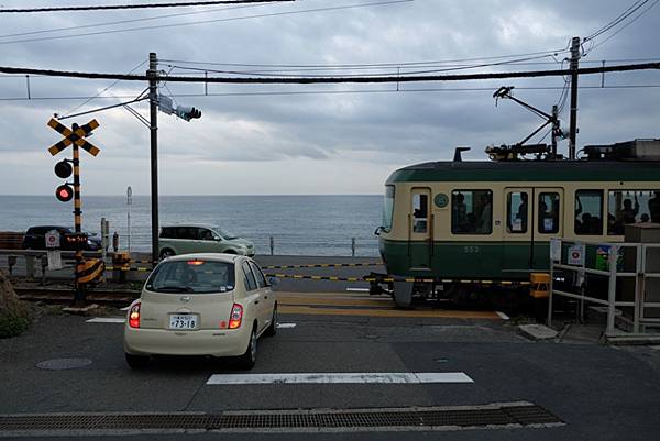 腰越至江之島的這段路,我選擇用步行的方式前往,這段路剛好就是電車跟一般道路共用的路段,每當電車行經時,一般車輛都得靠邊先讓電車經過,路面的寬度就真的僅能容下電車跟兩旁停等的車輛而已,真是個特別的畫面啊。