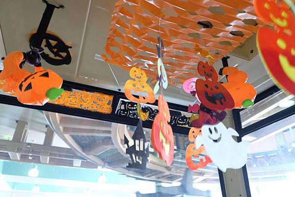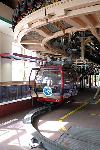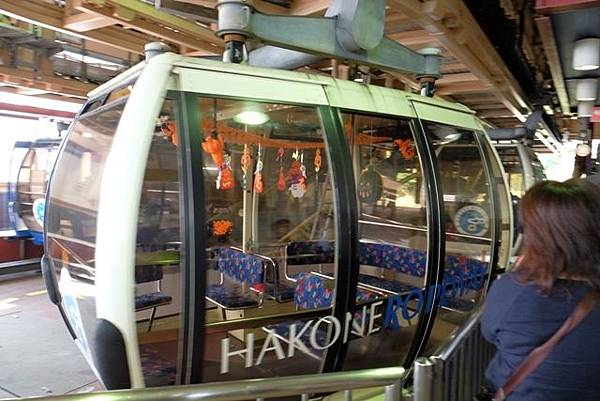 搭乘接駁車到小涌谷站搭登山電車抵達強羅轉乘登山纜車到早雲山,早雲山到大涌谷需要搭乘箱根空中纜車,每個車廂可坐18人,剛好搭到的車廂居然是萬聖節裝飾的。