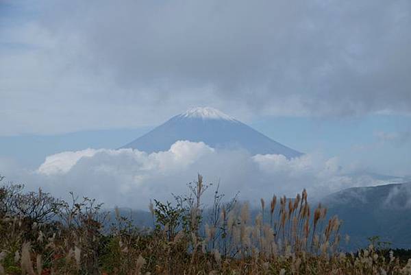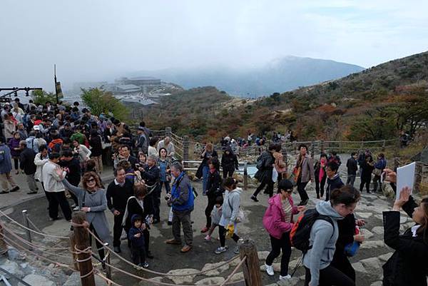 一早的太陽老早就消失的無影無蹤,大涌谷自然研究路最上方的地方等著要拍富士山一直不肯露臉,偶爾隱約出來一點點也沒辦法拍,等了30分鐘只好放棄慢慢走下來,這時候烏雲突然逐漸散去可以看到富士山了,大家都很興奮的停下腳步多按幾張照片。