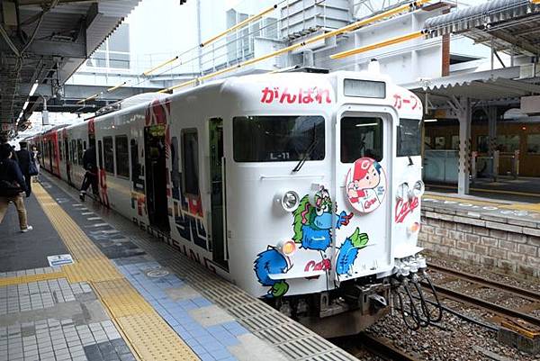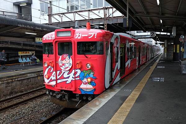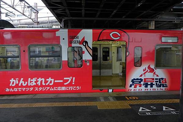 等待列車的同時剛好來了廣島鯉魚隊塗裝的這輛列車,雖然不能一路直接到達宮島,不過既然有機會看到還是先上去搭看看,到五日市站再下來等候原先要搭的那班車就好。