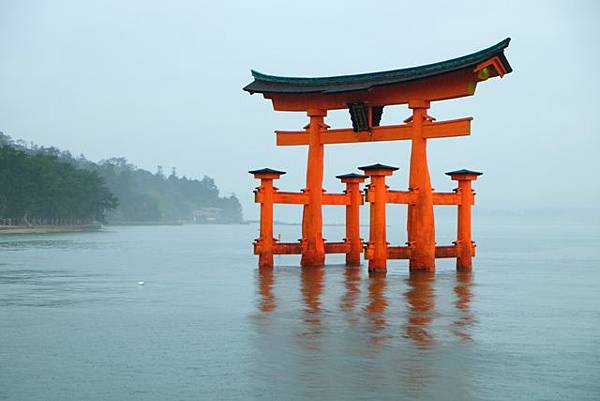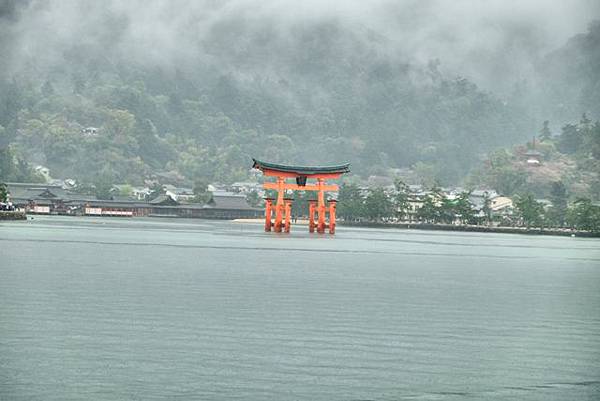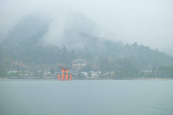 搭乘山陽本線到達了宮島口,步行前往搭乘渡輪,拿JR PASS搭乘由JR經營的渡輪是免費的,可惜雨還是都沒有變小的跡象,只好撐著雨傘上船去。因為陰雨天視線並不好窗外總是一片霧茫茫的,不過渡輪抵達宮島前還是可以看到海上的紅色大鳥居。
