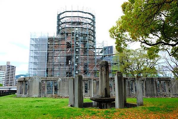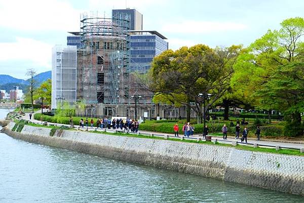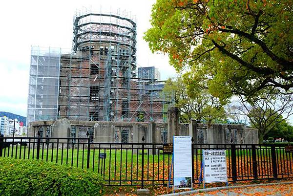 今天就要結束在廣島的行程了,退房後先寄放行李,再度又搭上了路面電車前往和平紀念公園,出站後和平紀念公園就在對面,原爆屋頂因為整修維護的關係旁邊的鷹架都還沒拆掉,不過至少還看的到屋頂,比之前全部被包起來好多了。