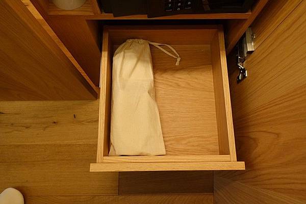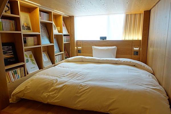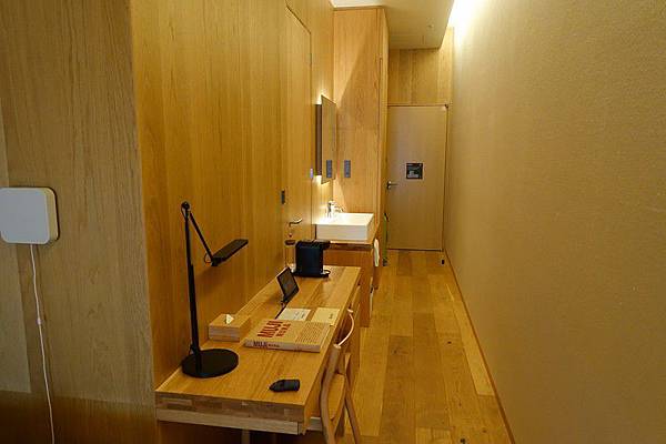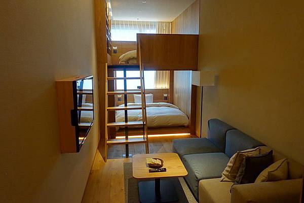 我訂的是房型TYPE G的上下舖雙床房,這個房型只有4間,空間有效設置為上下床舖,所以可以放兩張大床,躺起來超舒服,可以用「大」字形睡覺都沒問題。房間採用大量的木材元素,非常的狹長,從門口走到床舖的距離覺得特別遠,不過房間樓高高度比一般飯店要高。