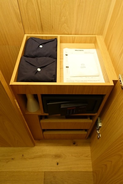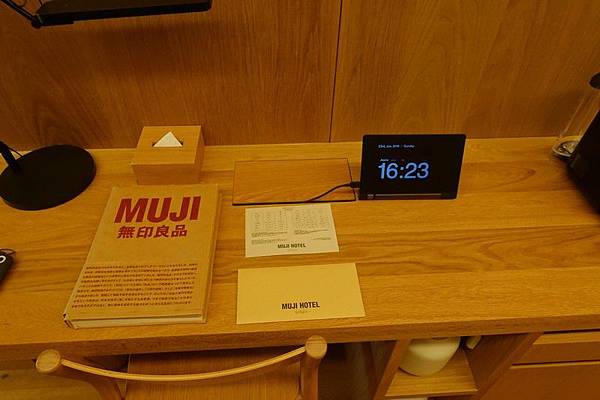 從JR有樂町走到飯店大約要5分鐘,1樓到5樓都是MUJI賣場,6樓除了飯店大廳之外,其餘空間是「ATELIER MUJI」,有2個「Gallery」以及、「Library」、「Salon」跟「Lounge」。從1樓直接搭電梯到6樓飯店大廳辦理checkin,櫃檯送了一個紀念品(口哨),然後給了一小瓶芳香精油,有薰衣草及葡萄柚可以選擇。