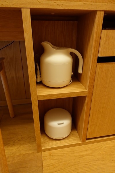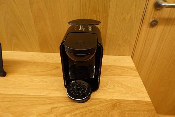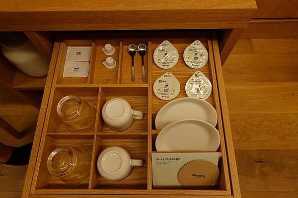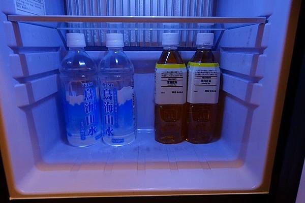 冰箱裡有礦泉水及無印的茉莉綠茶,比較特別的是這瓶鳥海山水的保存期限是6年,還真沒看過瓶裝水可以放這麼久的。咖啡機就不是使用無印自家的產品。