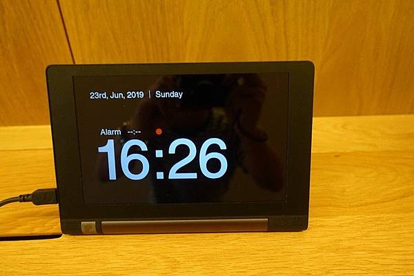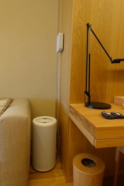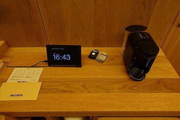 沙發前茶几上放置了無印自家的餅乾做為迎賓點心,書桌上的平板可以控制房間內的空調燈光,甚至窗簾跟鬧鐘也都從平板完成設定,也可以在鬧鐘響的同時窗簾一起打開並將燈光調亮