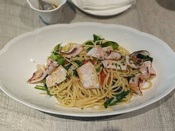 義大利麵的口感很好,有嚼勁但不硬,很彈牙,店家也有提供自製的辣油。餐點精緻好吃,服務人員也還蠻不錯的,看到鄰桌客人點的板煎放山雞肉看起來也好好吃的感覺,希望下次有機會再來品嘗看看。