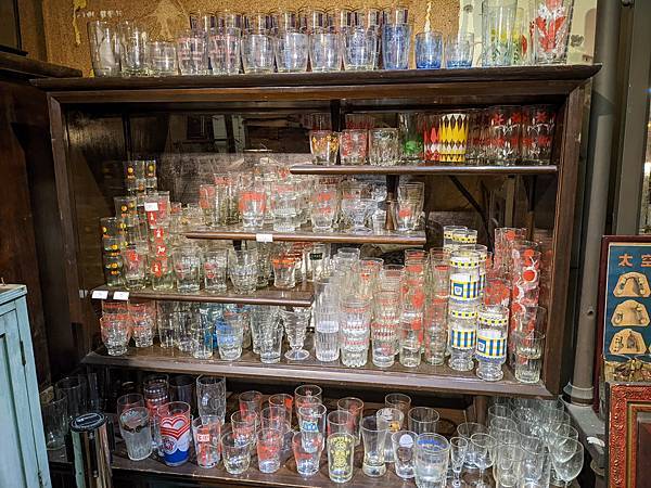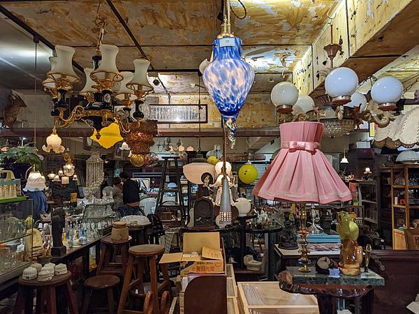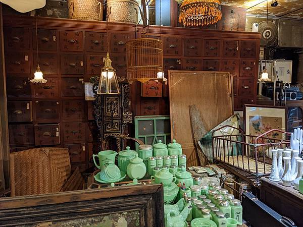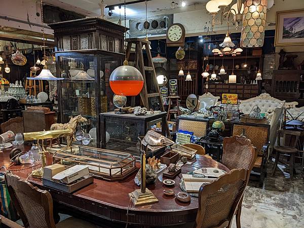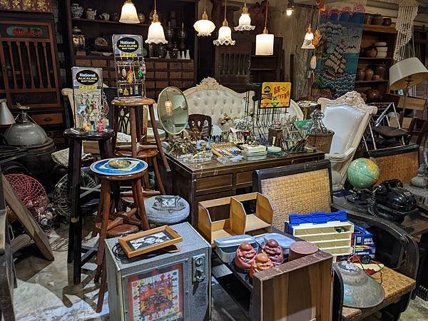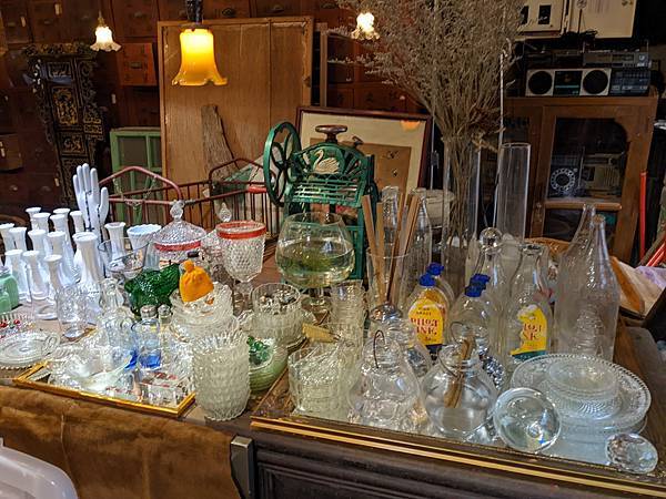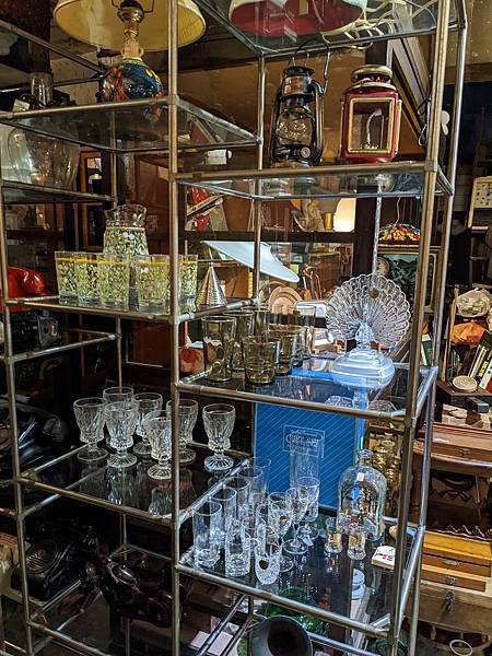 各式古董木櫃、燈具、玻璃杯瓶及老時鐘等等,可以慢慢閒逛。走到裡面好似穿越了時光隧道,大部分東西都可拿起來把玩欣賞,有需要想找的物件也可以請店員幫忙介紹。