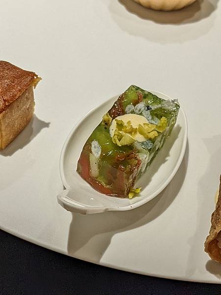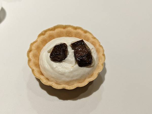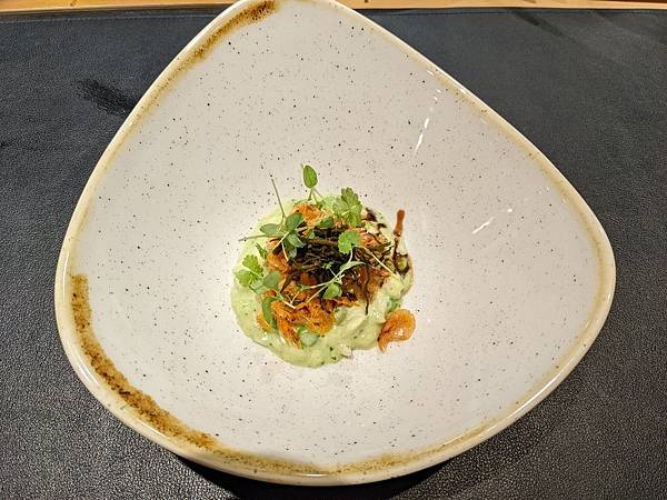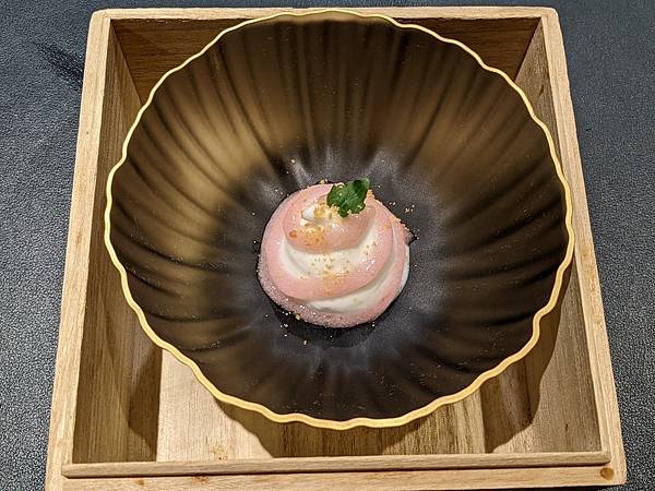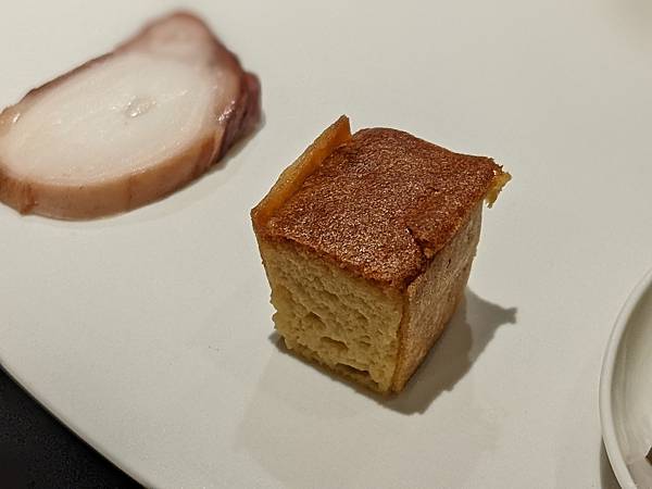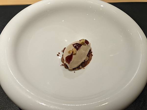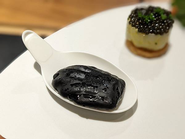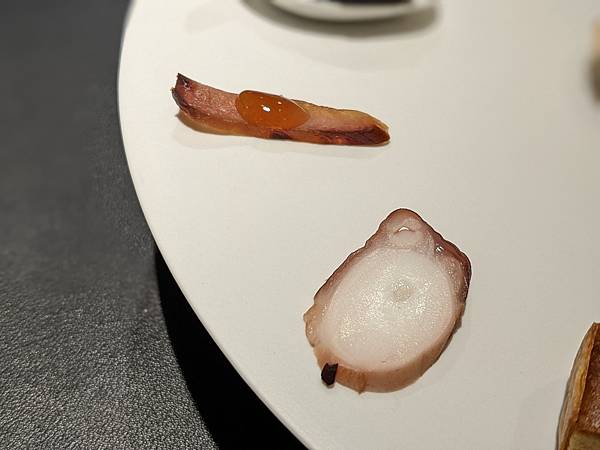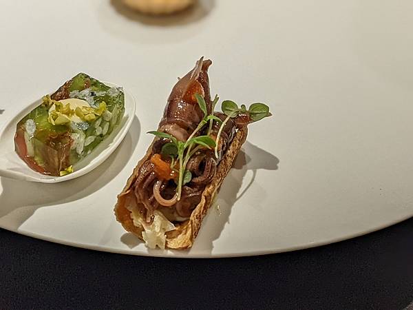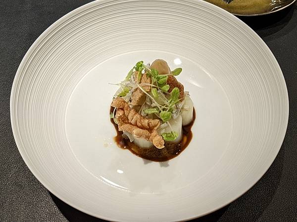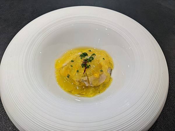這道是文蛤,一旁的中年夫妻比我先上這道料理,再跟主廚交流對談時,跟主廚講說這個台灣話叫做"喇啊",主廚還特別送這道菜過來給我,用台語講"喇啊",兩個人還一起笑了出來,"喇啊"搭配清爽醬汁口感很不錯。