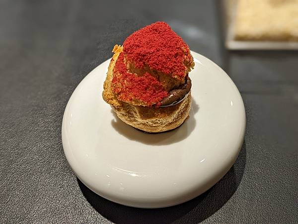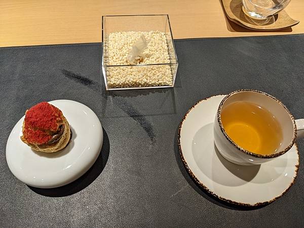 裡面包了米香的巧克力,泡芙小小一顆很好入口,上面灑了樹莓粉,另外點了一杯茶