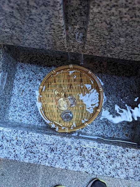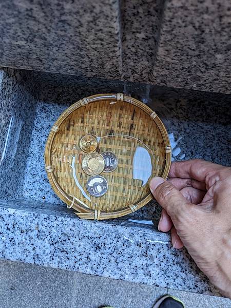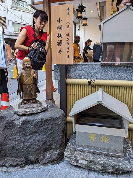 先到手水舍洗手再到主殿參拜,日本橋七福神之一的福祿壽神,祈求福德健康長壽,另一側弁財天可將身上的零錢放進竹藍中於水中洗淨,之後將洗淨的硬幣放回錢包中當錢母,我也特別準備日幣跟台幣零錢來洗錢。