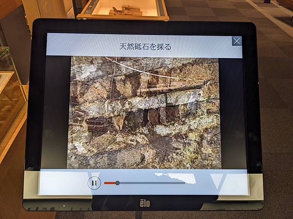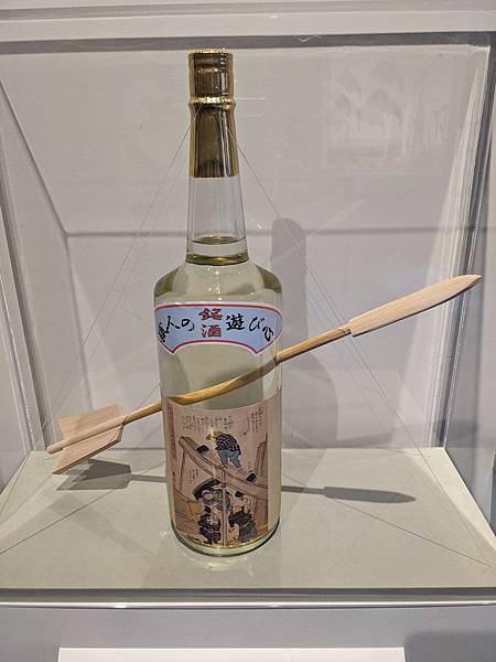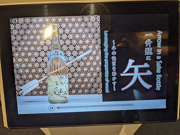 覺得最吸引我目光的是這個一升瓶に矢,透過下方的小螢幕有影片解說工匠是如果製作這個1.8升裝酒瓶上的箭沒有重新接上。瓶子沒有打開,裡面還有清酒,箭是怎麼穿過的喔。
