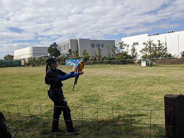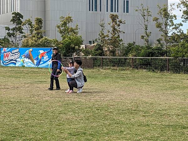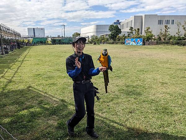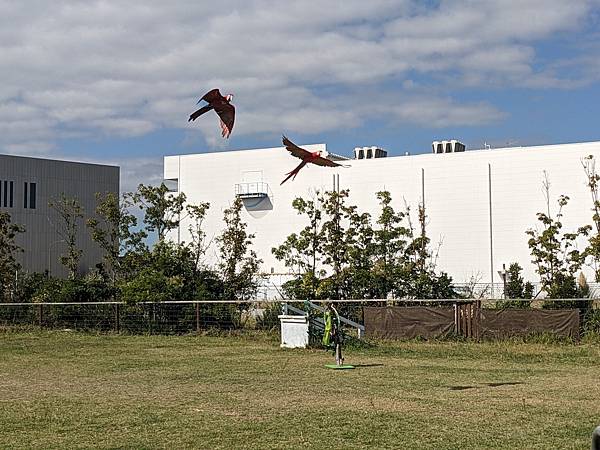 也有邀請民眾到場上互動,小朋友跟家長手拿著呼拉圈,鸚鵡飛翔從呼拉圈穿越最後停在訓練師手臂,觀眾們都以熱烈掌聲回應精彩的演出,同時空中也有金剛鸚鵡不斷地盤旋飛翔,整場表演有30分鐘,看得很過癮,最後散場時訓練師帶著鸚鵡一直跟還在場邊的觀眾說byebye。