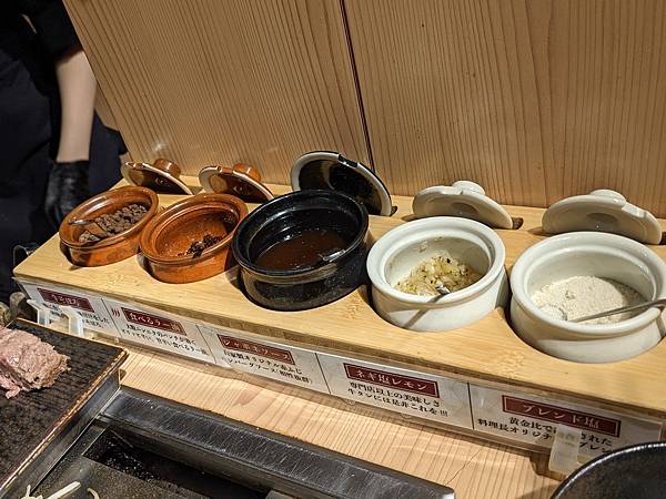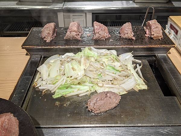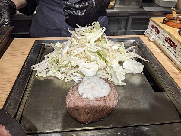 原本想要吃三宮店的グリル一平,結果遠遠看到沒人,一到門口才發現號碼機已經有33組在排隊,只好直接離開走到M-INT用餐,看到這間神戸赤ふじ沒吃過想說進去試試看,點了黒毛和牛100%赤ふじハンバーグステーキ& 牛タン60g,比較像是極味屋的用餐方式,稍微把漢堡排外層煎到微焦後,讓客人自己在鐵板加熱。