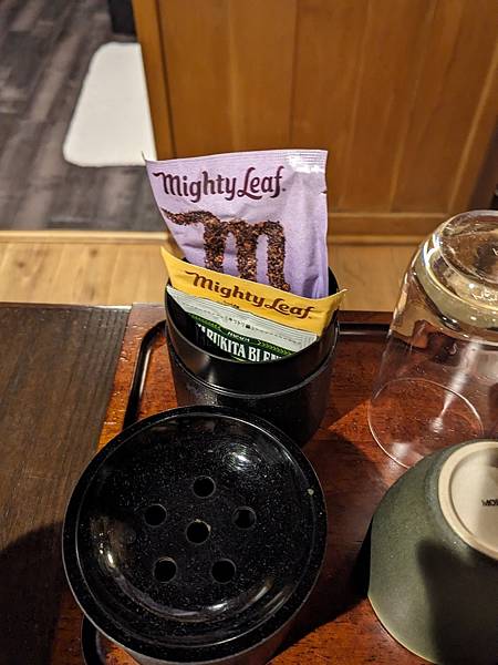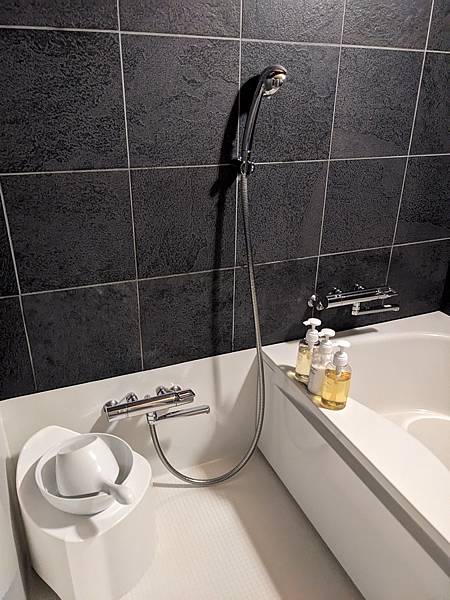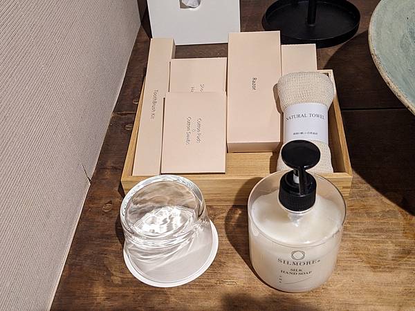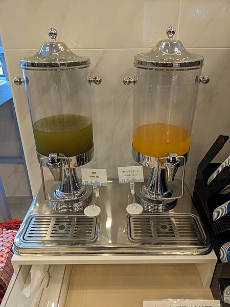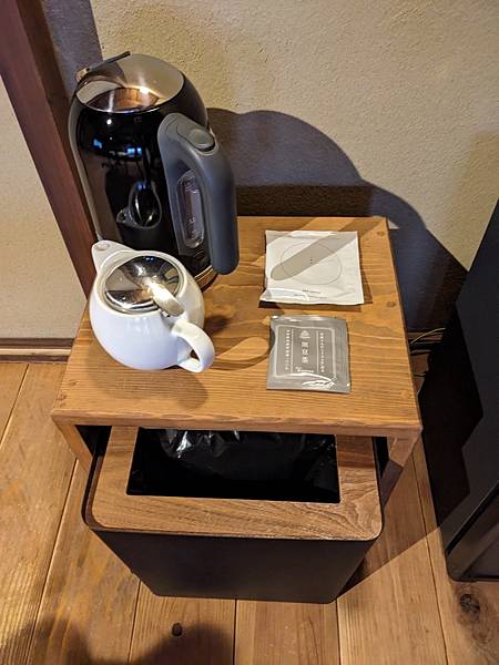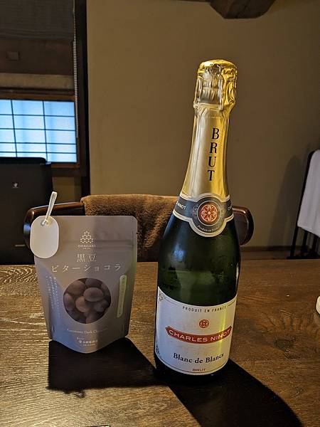 小冰箱上面有2瓶水,冰箱內的飲料全部都是免費提供的,除了果汁汽水可樂外,還有紅白酒、啤酒與清酒。另外也有準備了咖啡及茶包,結果還說有禮物要送我,問我要有酒精的還是沒酒精,選了有酒精的直接又拿了一大瓶白酒+黑豆巧克力送我。。