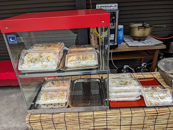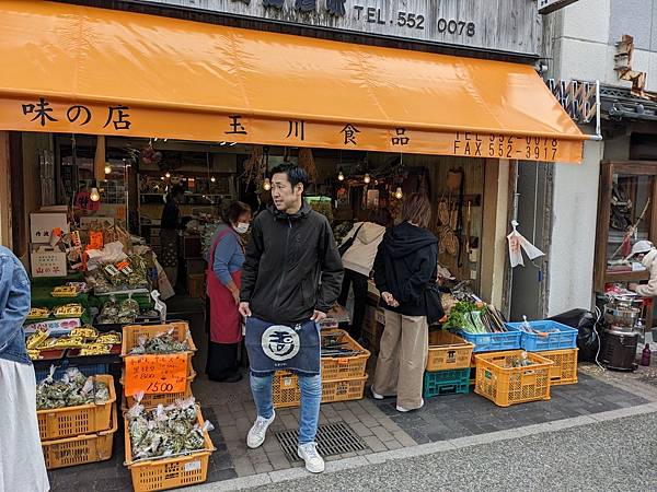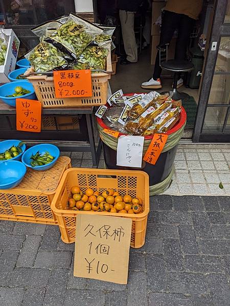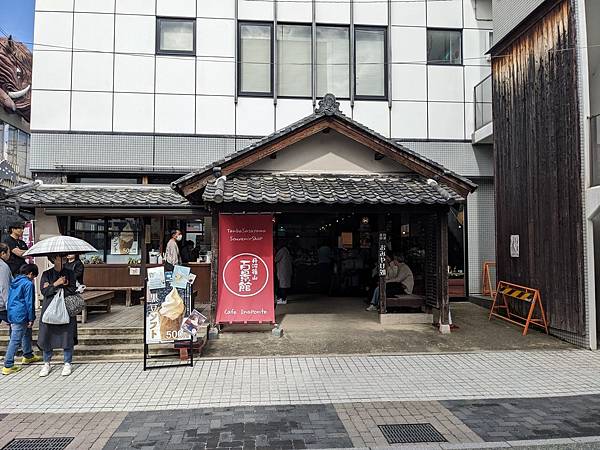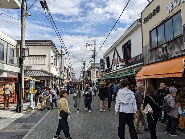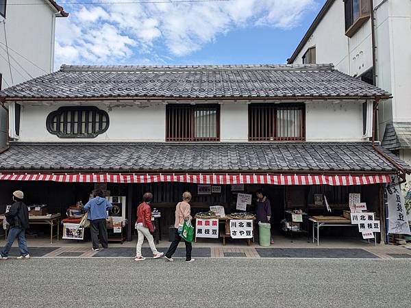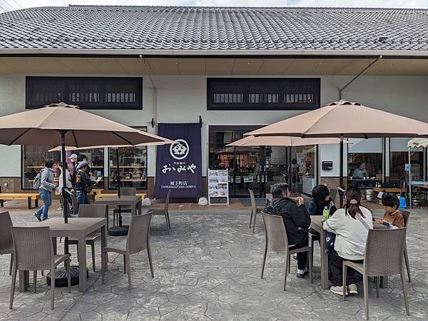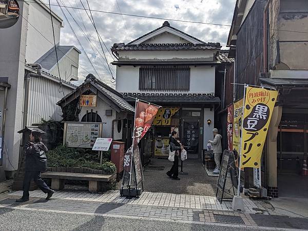從公車站走過去,一開始沒看到幾間店家,遊客也很零散沒看到幾個人,比我早下車的乘客都很快地往前走。後來才看到前面路口開始變成行人徒步區封路,不知道是剛好今天周末才有徒步區的規劃?路口旁的丹波篠山百景館販售許多當地物產及伴手禮,周末的大街上許多販售黑豆、栗子及松茸等,正中午時刻倒也不少人潮,除了傳統商店也有幾間裝修新穎的店家販售著丹波篠山牛漢堡。