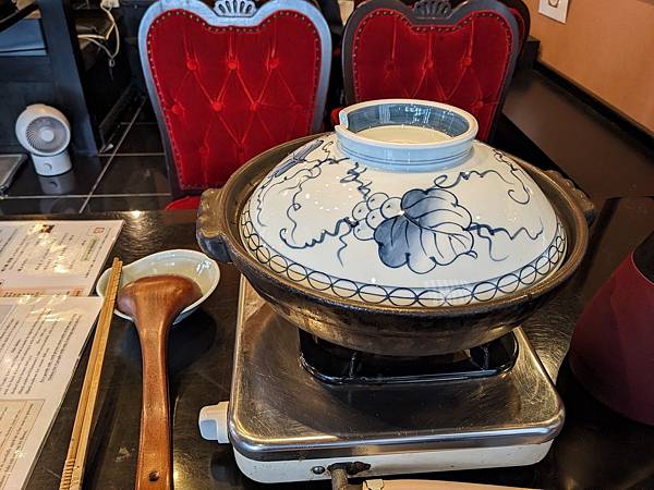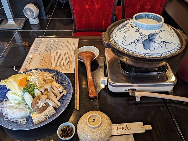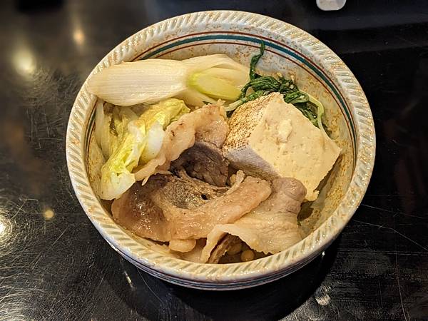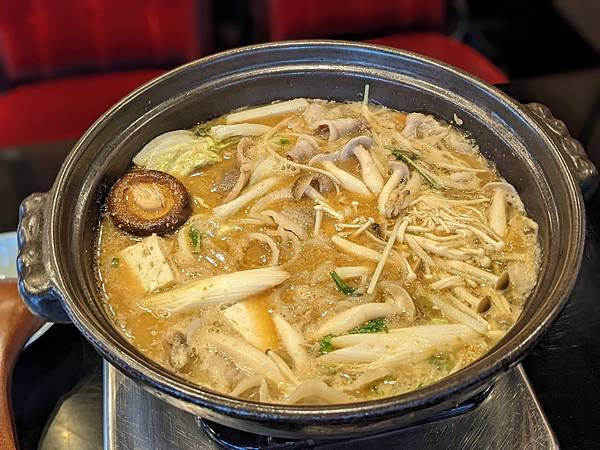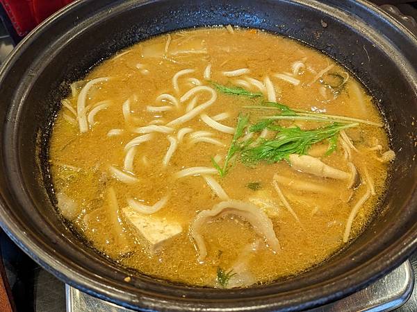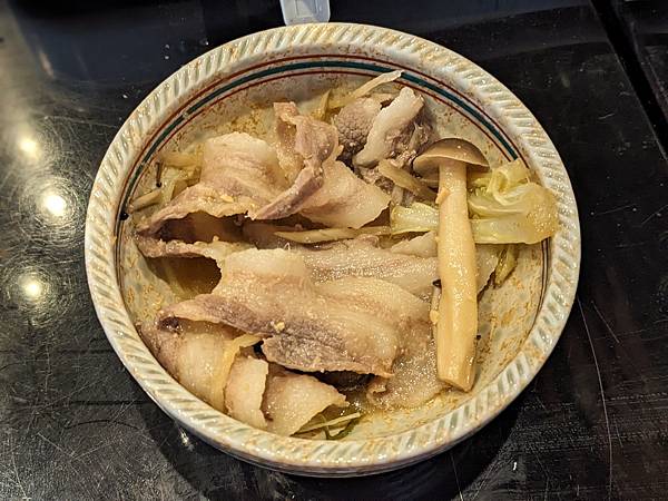 在臺灣正好因為非洲豬瘟疫情禁宰禁運的這時,能吃到這個牡丹鍋真是太奢侈太幸福了,山豬肉搭配濃厚的味噌口味很棒,山豬肉不會太乾柴,居然整鍋的食材都快吃得差不多了。結果最後又來加了一份烏龍麵,就只能再吃一些。