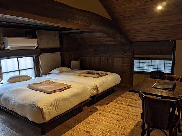 小閣樓內有雙張大床,簡單的桌椅,重新裝潢後整體看起來很新不會陳舊感,但也有保留老屋原有的痕跡,這部份真的衡量取捨很不容易,當然木造房子的隔音就無法太過要求。房間內並沒有電視跟時鐘,就是希望旅客忘卻時間,好好享受住在這裡的短暫時光。