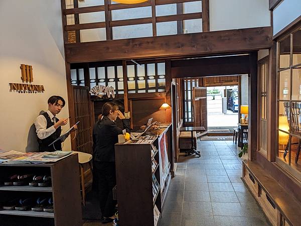 進門後確認訂房資料,因為還沒到3點,所以先帶我到房間內休息,然後有專人到房間內辦理checkin,住宿的這間就在2樓得從1樓櫃檯的小樓梯上來,把鞋子放在鞋櫃內後直接上來。人員仔細介紹旅宿環境,並確認了早晚餐用餐時間,也一併安排了明天接送至JR篠山口車站。