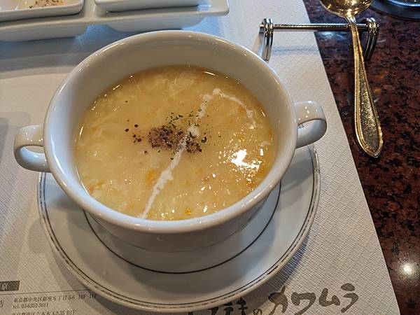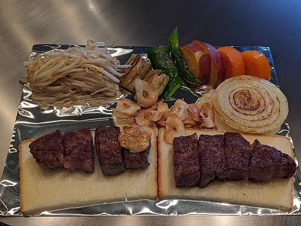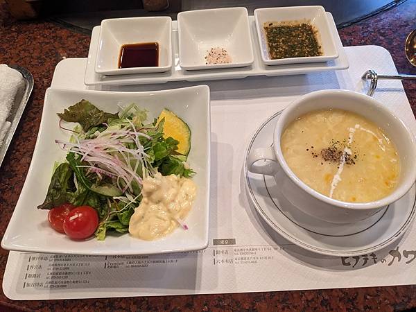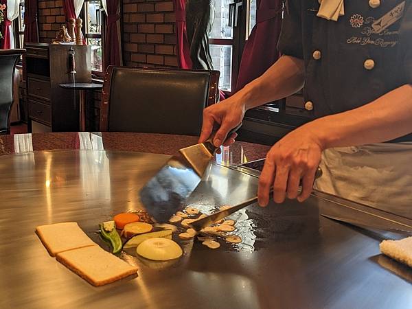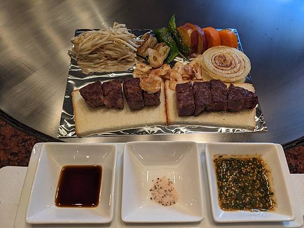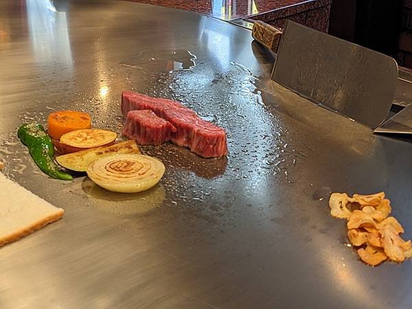之前也有吃過石田屋的A5午間套餐,入座後這次就點了特選国産牛ステーキランチ 120gロース 5,060円,包含湯品、沙拉、特選國產牛排、蔬菜盤及餐後飲品。依序上菜後,師傅出來幫我料理前特別把肉放我前面讓我拍照,接著就是看師傅表演,料理完師傅就離開,這個吧檯就剩下我一個人慢慢享用。