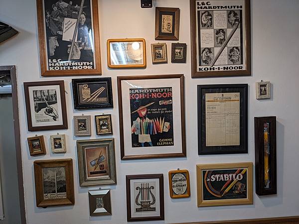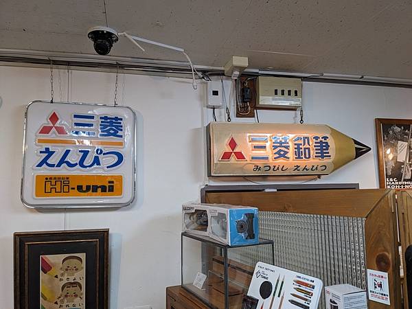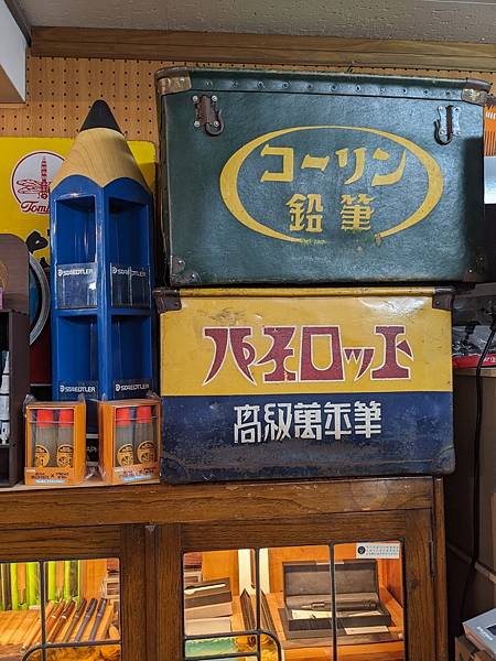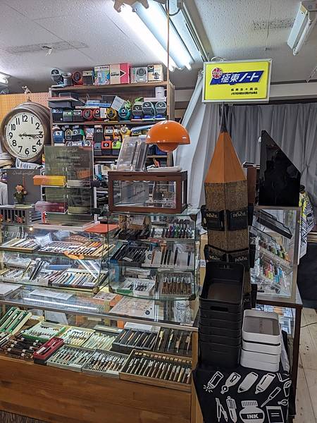 櫃檯前方的鋼筆櫃,後方也放滿削鉛筆機,復古的大時鐘時間不太對,應該是故障了。