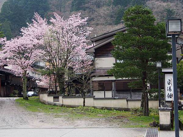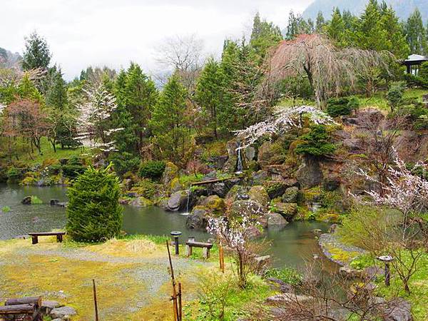 離開松本城後,準備前往上高地,不過在這之前要先去用餐,來到平湯溫泉的這家旅館,旅館外的櫻花還開著。導遊說這家旅館旅行社也偶爾會來住,不過有個問題是旅館房間沒冷氣,所以夏天就不會來住這邊。旅館內的庭園造景也是很美,只是沒想到準備用餐的同時,外面開始下起大雷雨了。