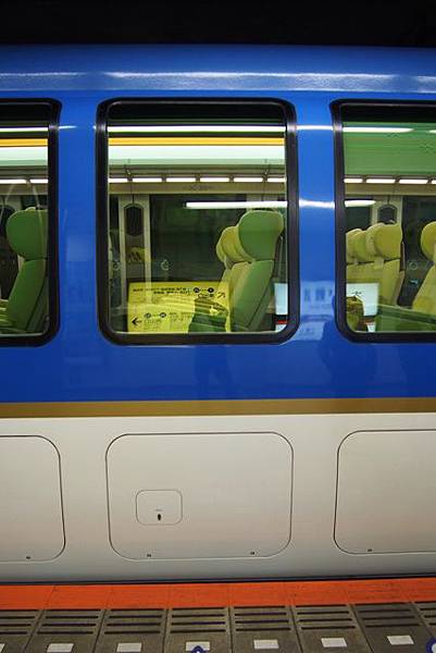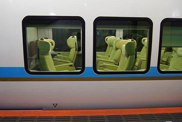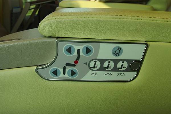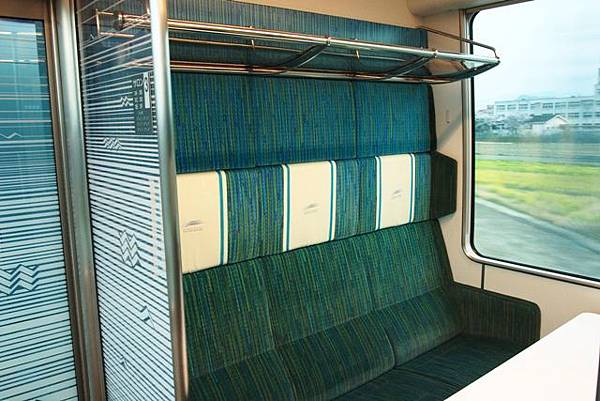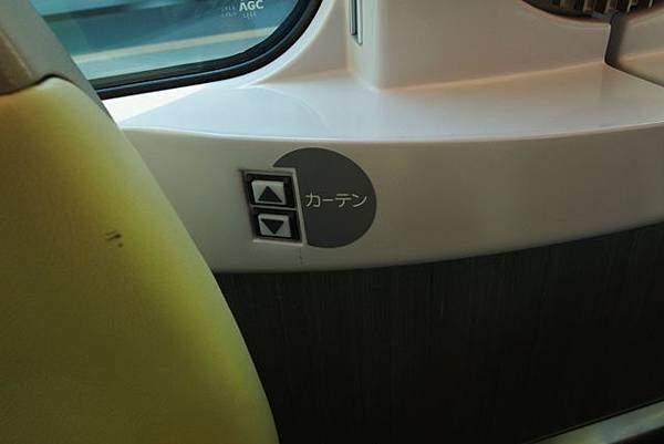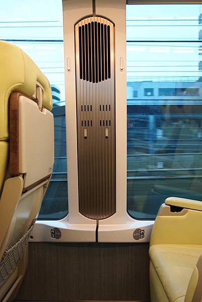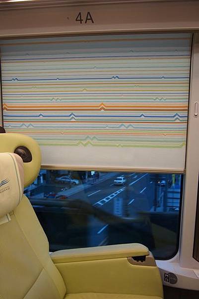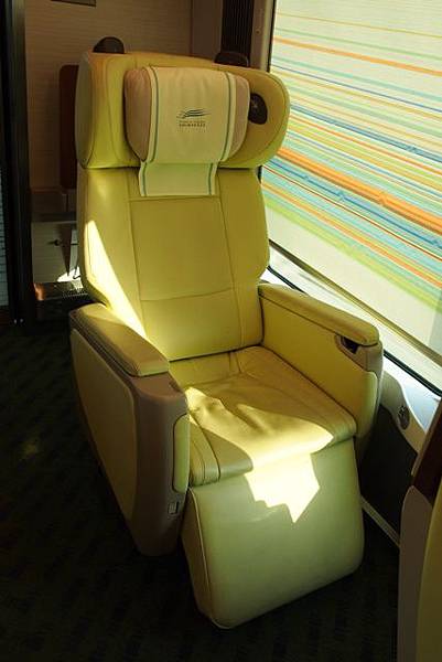列車進站時可別顧著拍照忘記上車啊,否則車可是不等人的,島風號頭尾1號及6號車廂是展望車廂,雙層的挑高設計得先上樓,所以看出去的視野也完全不一樣,同時1號及6號車廂一進來設有置物箱,小型的行李箱都可以放的下喔。找到我的座位後,服務人員已經把濕紙巾跟紀念乘車證放置於窗戶旁,原本想要把窗簾拉上去,突然忘記了島風號的窗簾是電動控制的。座椅可是超級豪華的按摩椅,可以調整腳踏墊,椅背及腰靠的角度,並啟動按摩功能。座椅間距很寬敞,把腳往前伸直勉強碰到前方座椅而已(是我腿太短嗎?),接著就是來去其他車廂看看吧。
