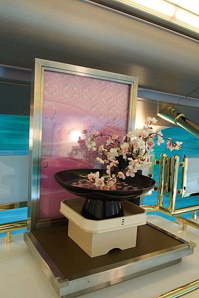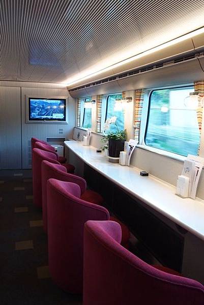 2號及5號車廂為豪華車廂,座椅同樣是鵝黃色真皮座椅,經過5號車廂時,整車幾乎都是旅行團的,還在猜拳玩樂很熱鬧。 4號車廂為3間沙龍座席及和式包廂跟洋式包廂各1間,都是需要另外加價的,可惜1個人無法訂位不然還真想坐包廂,裡面連電視都有真棒,3號車廂為餐車,販賣各種餐點及紀念品,還設置有上下兩層的典雅咖啡座,一邊享用餐點同時欣賞車外風光。