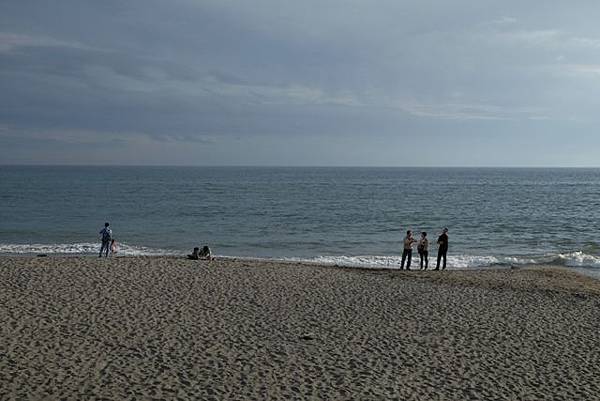 回到長谷站搭上江之電,在七里濱站下車沒多遠的地方就可以走到沙灘去了,雖然天空陰陰的還是有些人在海邊戲水,遠處還有在衝浪的人,江之島就在遠遠的彼端。