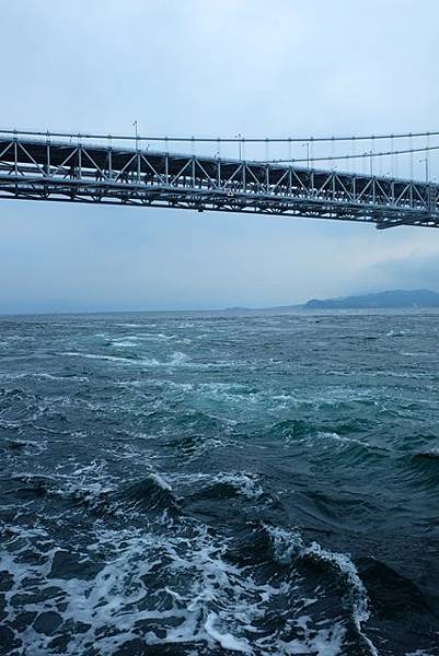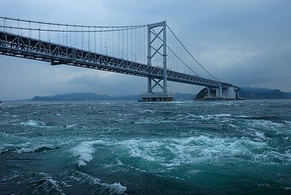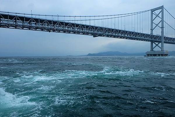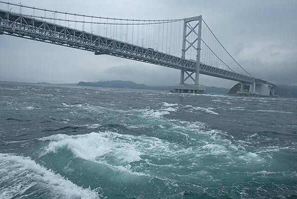 到達鳴門觀光港時已經有一班10:20的大型観潮船出發了,所以只能等下一班11點的,不過幾乎大型遊覽車的人都是上了10:20那個班次,所以等到11點出發時,船上根本沒有幾個人,我看是不到20個人啦。反而也不用擔心視線會被其他人擋住受到影響。大型観潮船開了10分鐘後就到達了鳴門大橋下方,這時候観潮船會放慢速度,可以很清楚的看見海上的漩渦,如果是初一、十五的時候漩渦還會更大更明顯的。