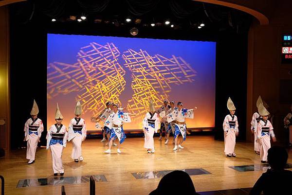吃完午餐後,前往阿波舞會館準備觀賞3點的阿波舞表演,走到阿波舞會館時發現2點那場的表演剛結束,有不只一個觀光團的樣子,其中也有臺灣來的觀光團,所以3點開始的這場,一開始連我居然只有8個人,主持人開場講到一半時還問了我們哪裡來的,結果有2個美國人,2個新加坡人,我1個臺灣人跟其他3個日本人,接著字幕上就換成了中文跟英文並列顯示了。後面雖然陸陸續續也進來幾個人,不過加起來還是不到20個人,表演者還是依舊賣力演出,並且有邀請觀眾一起上台跳舞,我也跟著他們一起上去玩,最後挑選幾個人送了阿波舞的頭巾,我想可能是因為外國人的關係,我跟另一位美國人都被挑選到還幫我們綁上頭巾。