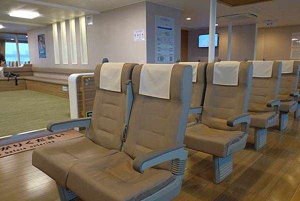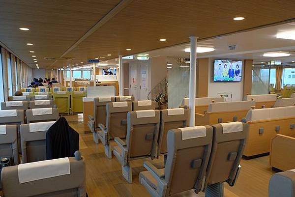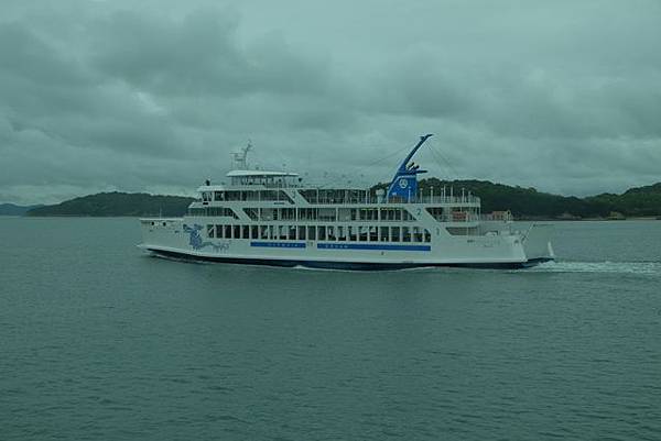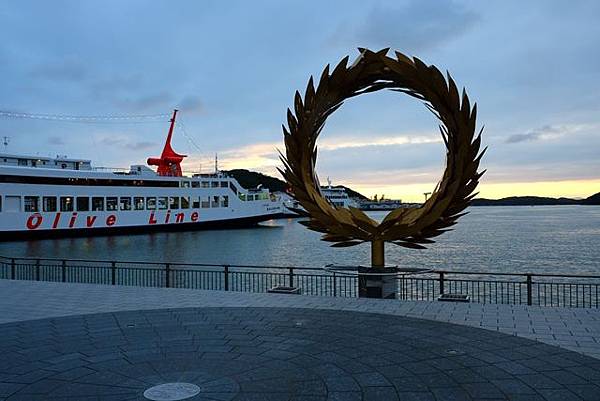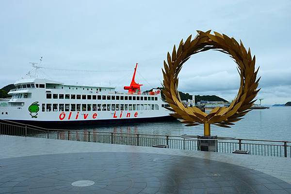 因為下起了小雨,所以就到地下停車場用昨天辦的自行車租借證騎了自行車往高松港的方向衝了。雖然雨不大不過外套還是都濕了,在高松車站附近居然一時找不到進入地下自行車停放場的入口,還好在高松港旁的發現了停車場就趕緊把自行車停放好,拿出華航送的小豆島船票直接上船了。這個班次的船真的很新,內部設施跟廁所等設備感覺就像剛出廠沒多久而已,航程1個小時很快的就到達了小豆島土庄港。