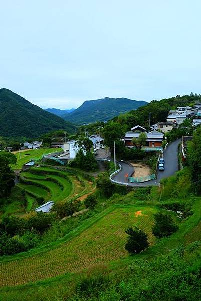下個景點要去看梯田,跟著導航一直開,原本記得是要在春日神社這邊停車再走上去,不過按照ORIX給我的電話號碼輸入導引的路線還要繼續往上方開,我也就按照導航繼續走,不過道路越來越窄直到導航結束的地方的確是已經很高處了,左右觀望了一下,上方還有車開下來的地方髮夾彎道路寬度很大,就跟著停在一輛車的後面了。
