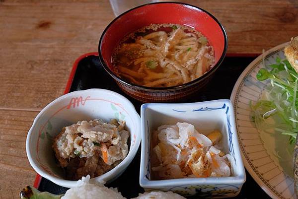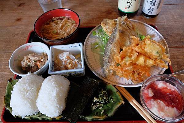 從上方開下來後,找到了春日神社的停車場,在こまめ食堂點了棚田定食,接近中午用餐時間好在沒有太晚進來,不然後面有些人來的時候已經客滿只能在外面等待,送上棚田定食還會附上2瓶小豆島的醬油可以自己取用。