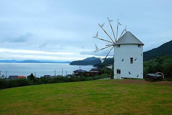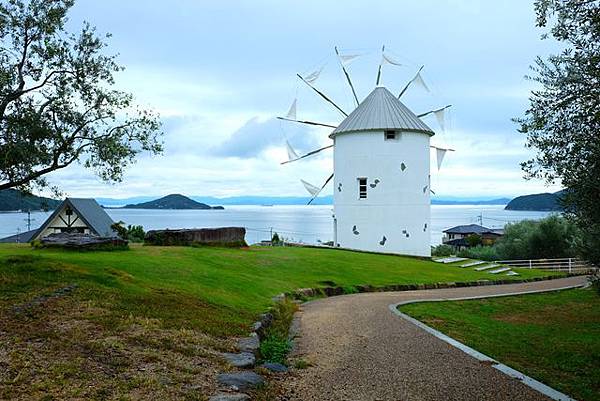 下一個要去的景點小豆島橄欖樹公園(道の駅小豆島オリーブ公園)又得開車一段距離,所以小豆島如果不自駕真的去不了幾個景點,我連在道路上看到的公車都不多了。橄欖樹公園因為真人版魔女宅急便電影曾經在此拍攝,也因此很多人都會去借掃把在這邊跳啊跳的cosplay一下,就連臺灣團整團老人也在這風車前輪流跳跳跳的,實在也沒那個時間等他們慢慢跳完我就先閃了。