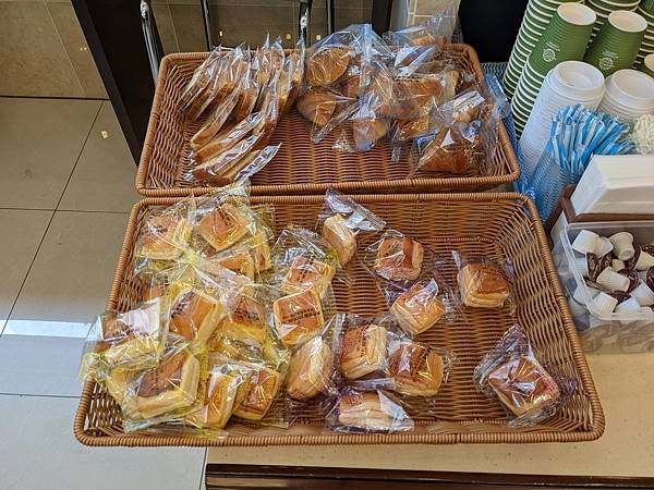 免費早餐也有提供餐盒可以打包,早餐雖然菜色簡單還蠻好吃的,麵包是個別包裝的很多人都直接帶回去吃。